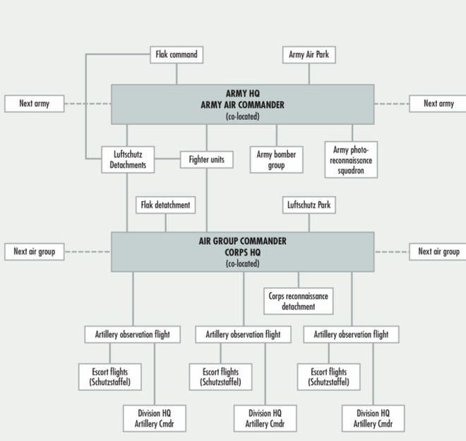 德军每个集团军都配有一名航空指挥官(Kommandeur der Flieger,简称 KoFl.),负责指挥该集团军所有飞机和高射炮部队,这些军官通常与自己的参谋人员和通信设备一起与前线的军部同驻,负责监督其所属军区内的所有空中行动。帝国空勤队指挥系统的另一个新增部分是防空军官(Luftschutz),他们带着由2名士官和4名士兵组成的小组,在前线公里处设立地面防空观察哨,通常与一个高射炮排同驻。每名防空军官都配备了经纬仪和高倍望远镜,负责监视并报告所有越过战线的敌军飞机的数量、类型、高度和方向。
